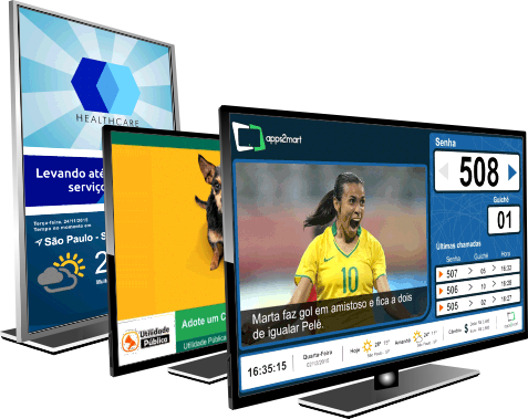 Produtos desenvolvidos para total comunicação visual de senhas indicadoras para o público do estabelecimento comercial ou social, visando grande impacto. Aliado a isso, telas grandes com interatividade e alta definição.